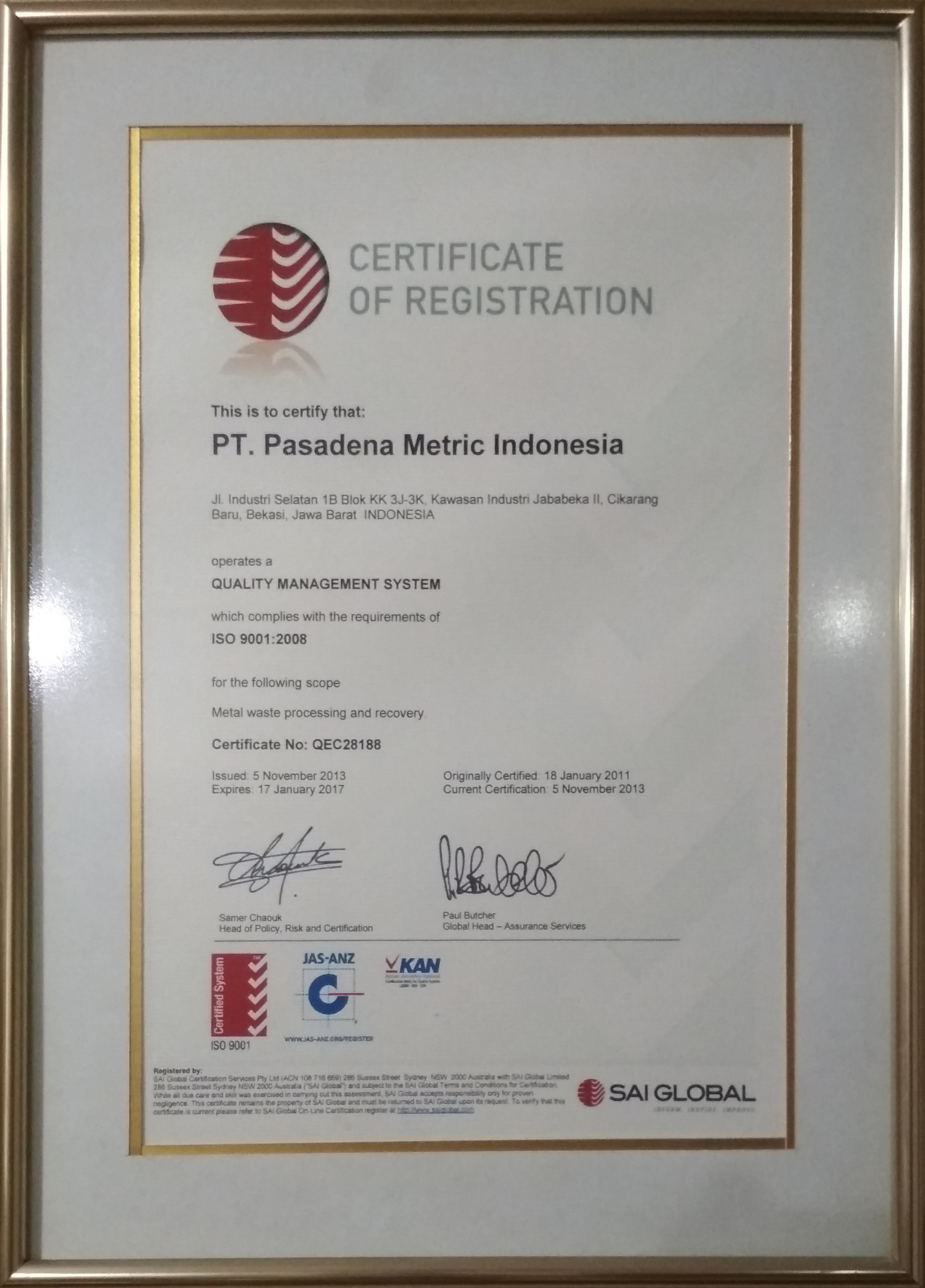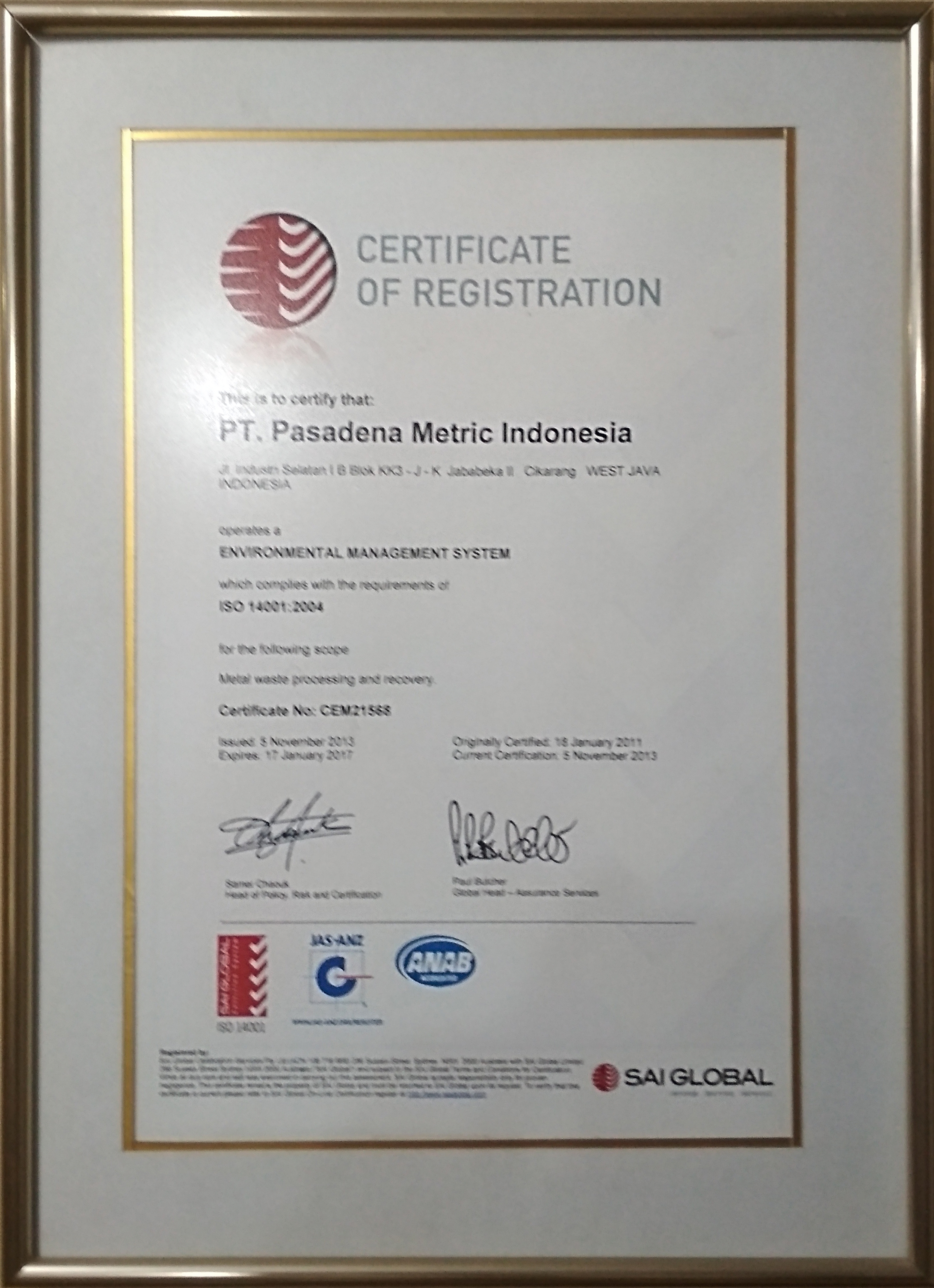 PT Pasadena Metric Indonesia adalah pengolah limbah berbahaya logam non-ferrous, dengan kapasitas 6000 tons per year. Pembangunann pabriknya dimulai pada tahun 2006berlokasi di Jababeka Industrial Estate, Cikarang, Bekasi.